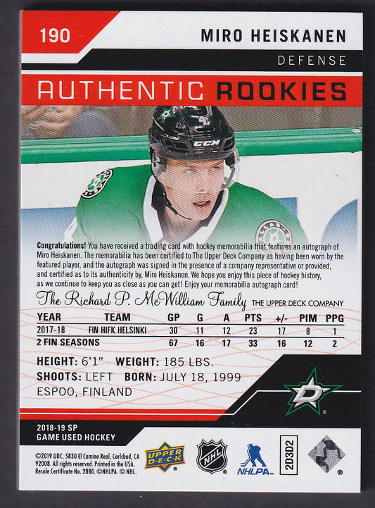 MIRO HEISKANEN - 2018 SP Game Used Authentic Rookies Auto #190