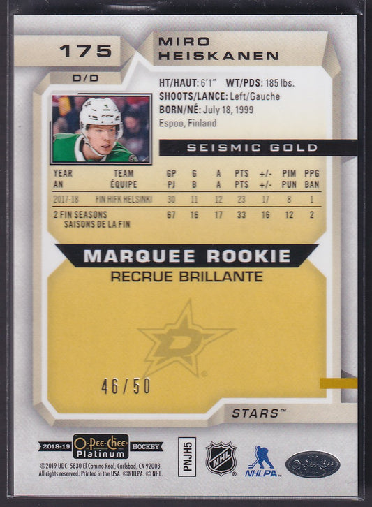 MIRO HEISKANEN - 2018 O-Pee-Chee Marquee Rookie SEISMIC GOLD #175, /50