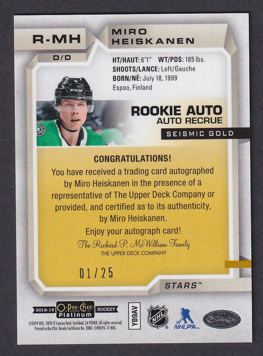 MIRO HEISKANEN - 2018 O-Pee-Chee Rookie SEISMIC GOLD AUTO #R-MH, /25