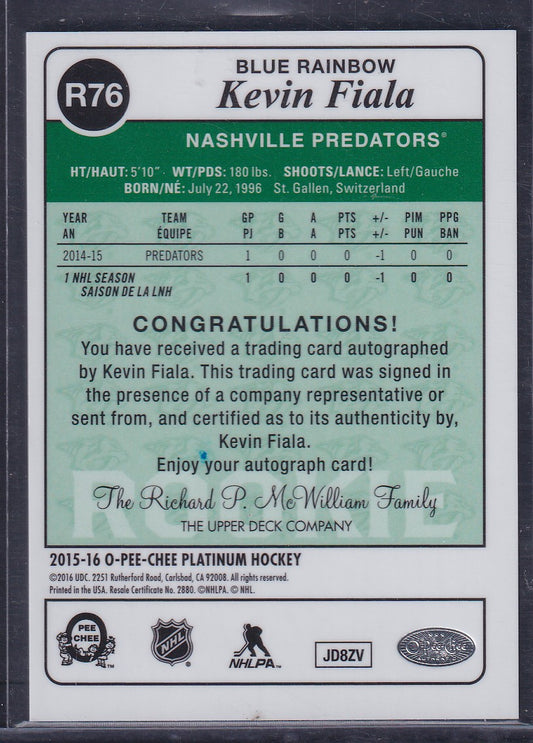 KEVIN FIALA - 2015 O-Pee-Chee Platinum Rookie BLUE RAINBOW Auto #R76
