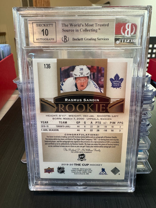 RASMUS SANDIN - 2019 The Cup Rookie Patch Auto GOLD #136, /24, BGS 9/10
