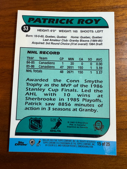 PATRICK ROY - 2002 Topps Chrome O-Pee-Chee Rookie Reprint #15