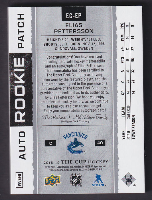 ELIAS PETTERSSON - 2018 The Cup Exquisite Rookie Auto Patch #EC-EP, /40