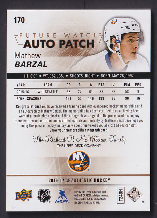 MATHEW BARZAL - 2016 SP Authentic Future Watch Auto Patch #170, /100