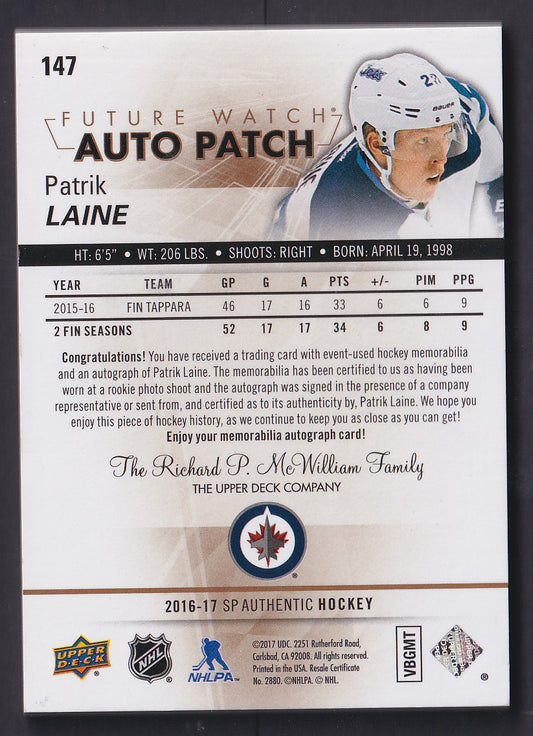 PATRIK LAINE - 2016 SP Authentic Future Watch Auto Patch #147, /100
