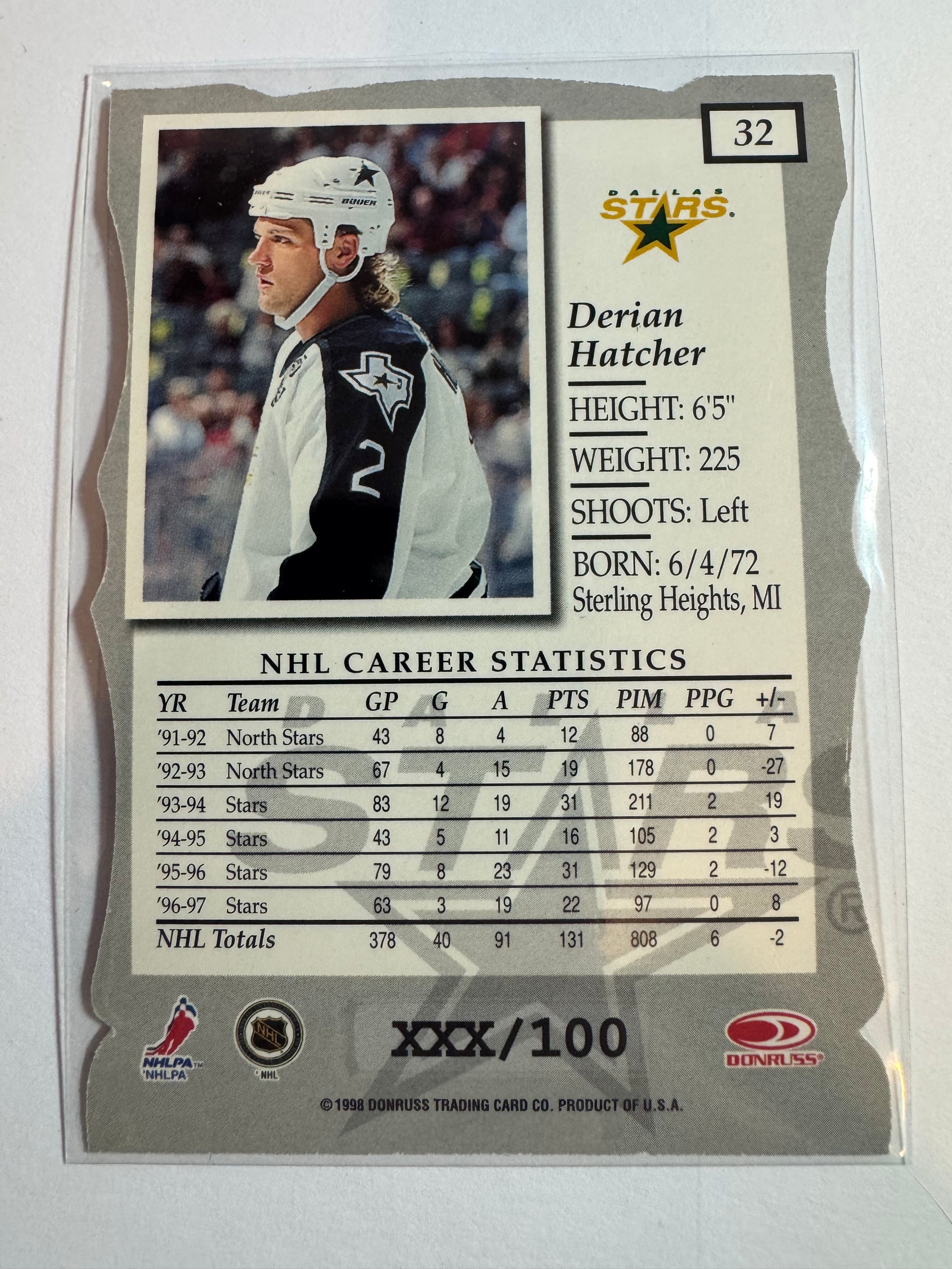 DERIAN HATCHER - 1997 Donruss Elite Status Die Cut #32, xxx/100