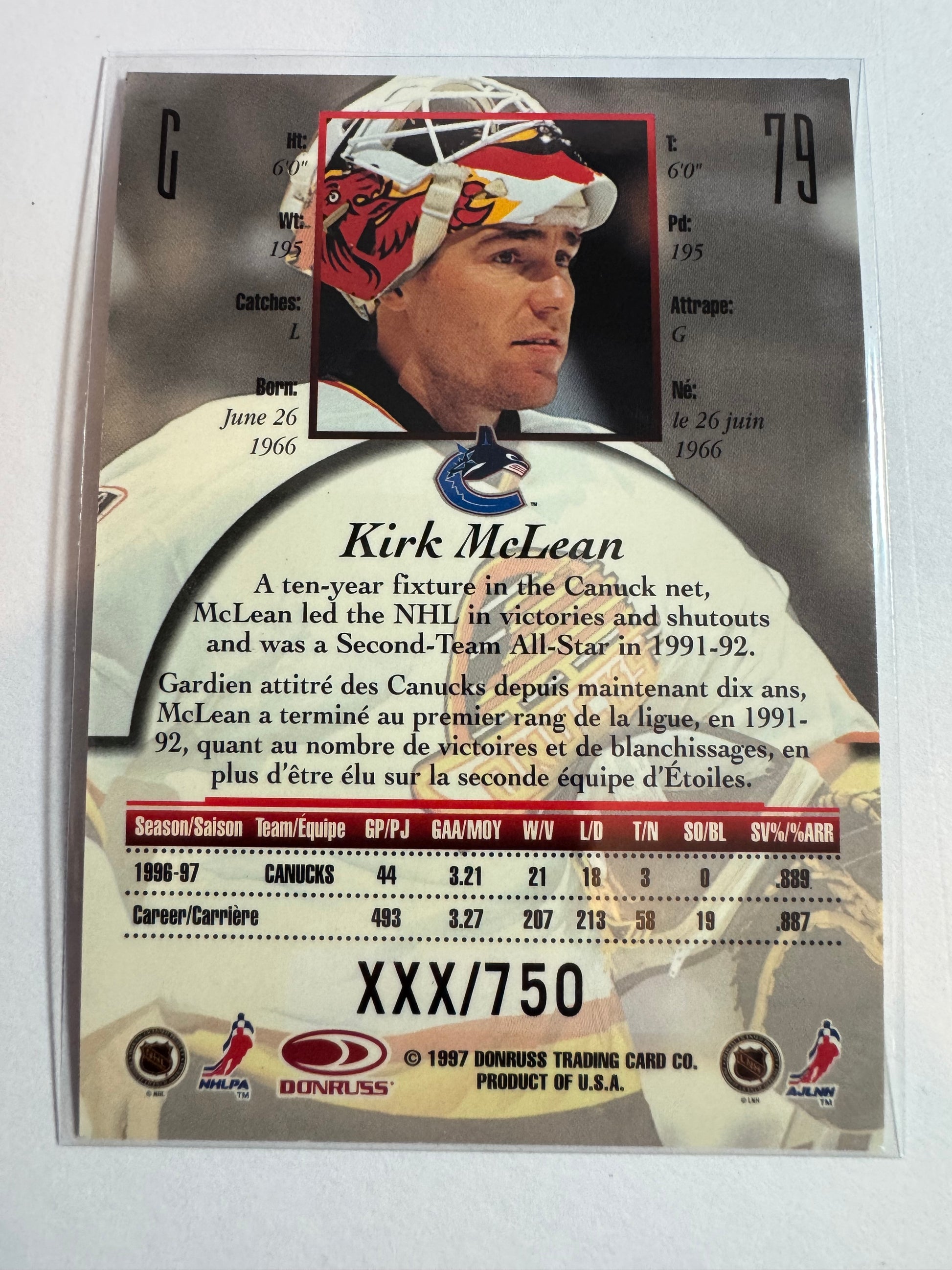 KIRK MCLEAN - 1997 Donruss Canadian Ice Provincial Series #79, xxx/750