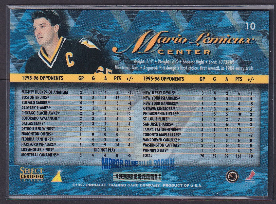 MARIO LEMIEUX - 1996 Pinnacle Select Certified MIRROR Blue w/ Coating #10